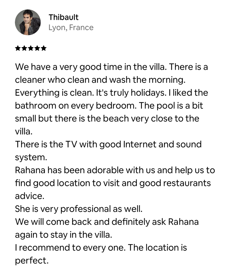 Enjoy an outdoor kitchen for al fresco dining, all set in a charming tropical setting. All rooms are air-conditioned for maximum comfort, and a garage is available for parking one car and two scooters. The villa is ideally located, just 5 minutes by scooter from the beach. You will also find shops, restaurants, gyms, supermarkets, and a laundry nearby, making your stay even more convenient and enjoyable.